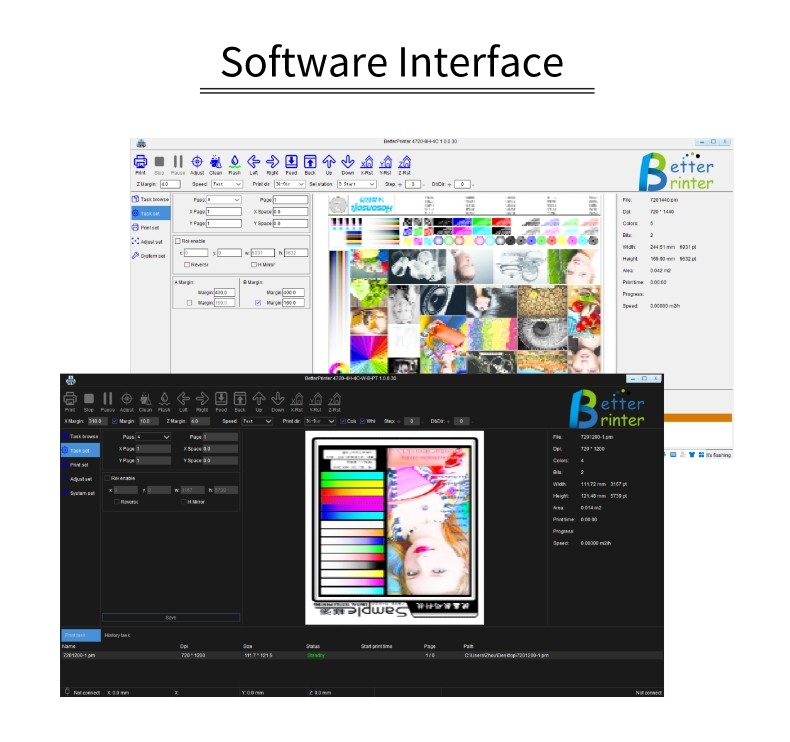 | El software RIP | Software RIP convencional como MainTop, Photoprint, UltraPrint, ONYX, Wasatch, etc. El software RIP también se utiliza para la fabricación de productos de alta calidad. | Apoyo a las funciones | Equipado con función RIP, impresión múltiple, impresión de ciclo de orden múltiple, impresión anti-colisión, medición automática de altura, impresión de punto de cambio, impresión de apagado del equipo,Reinicio automático, impresión desconectada, detección de escasez de papel, auto-prueba de la pila de tinta, etc. |